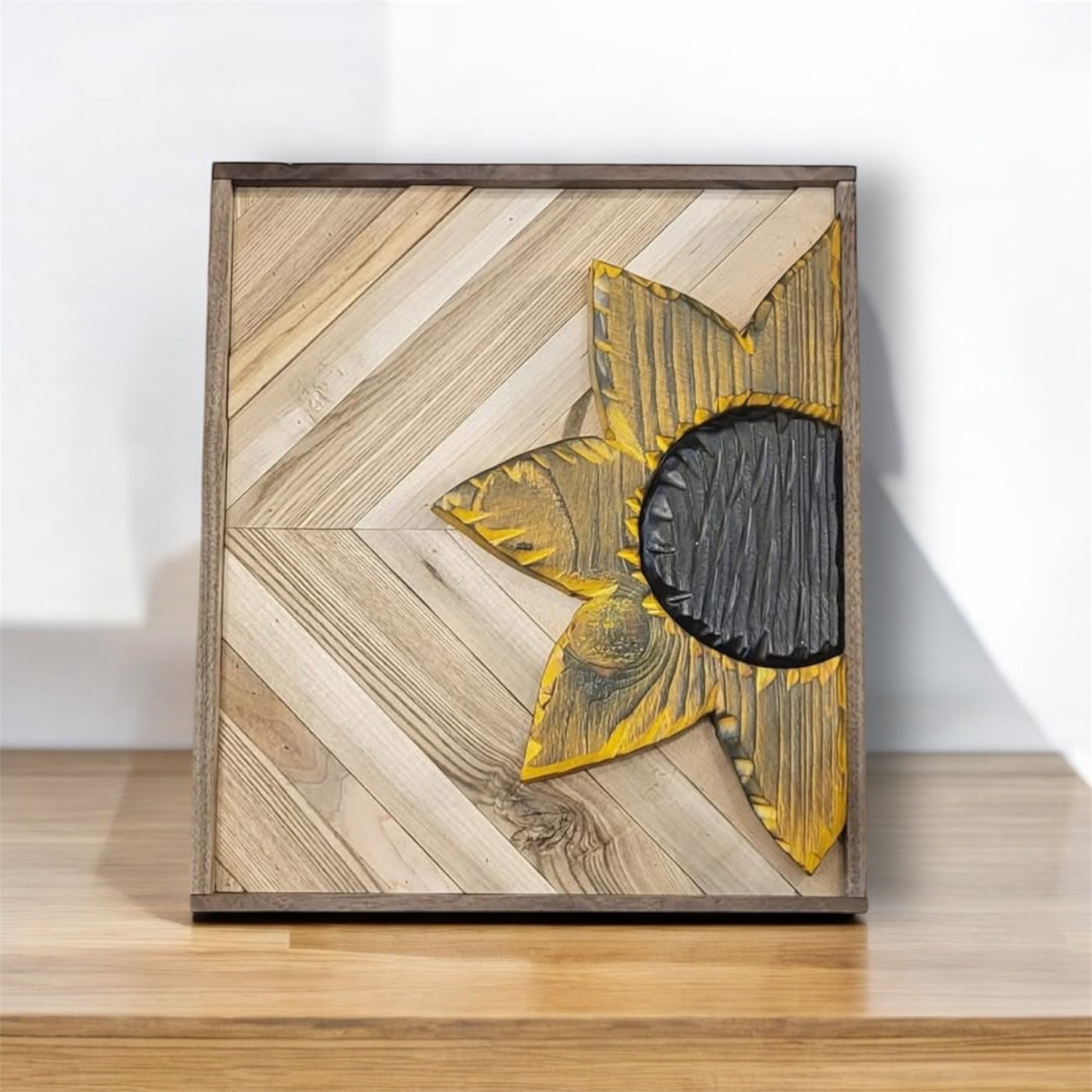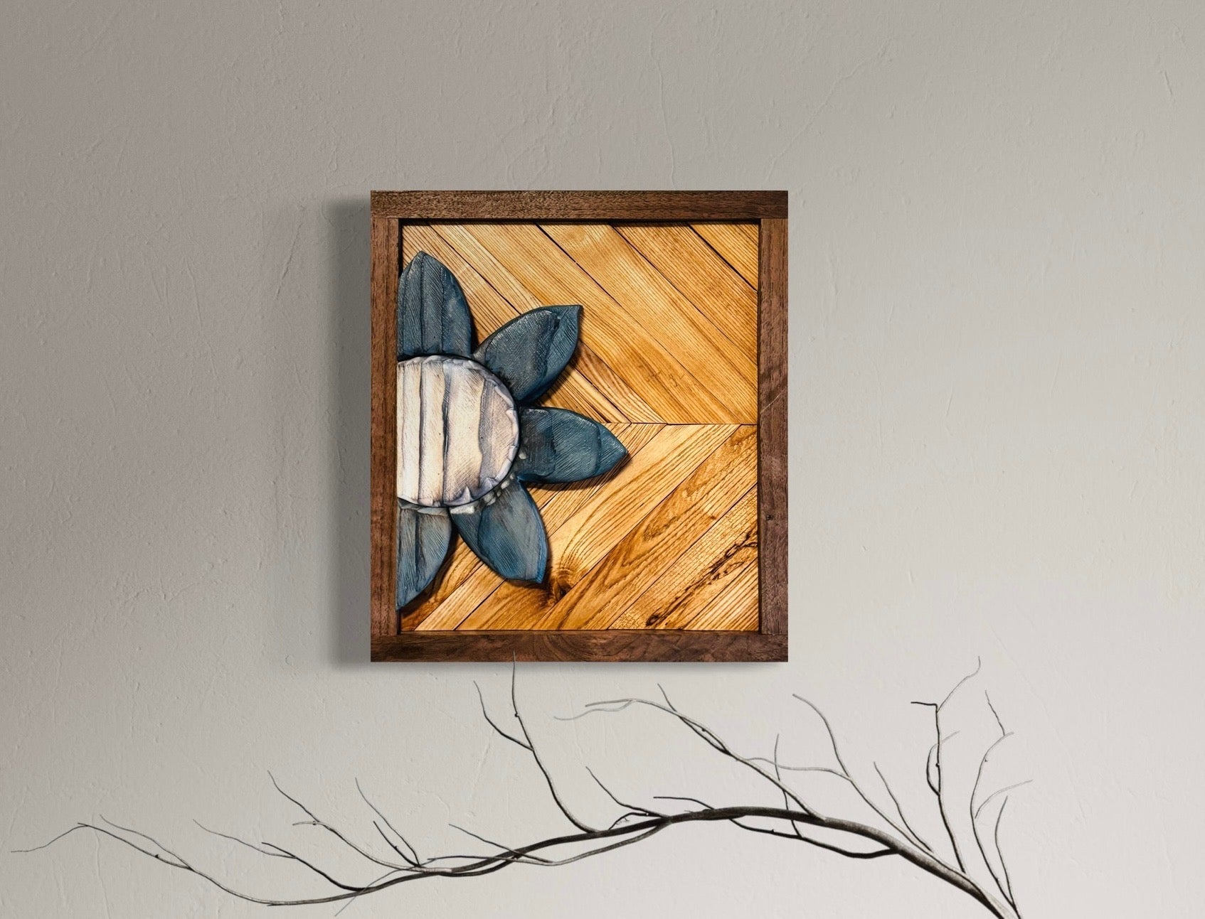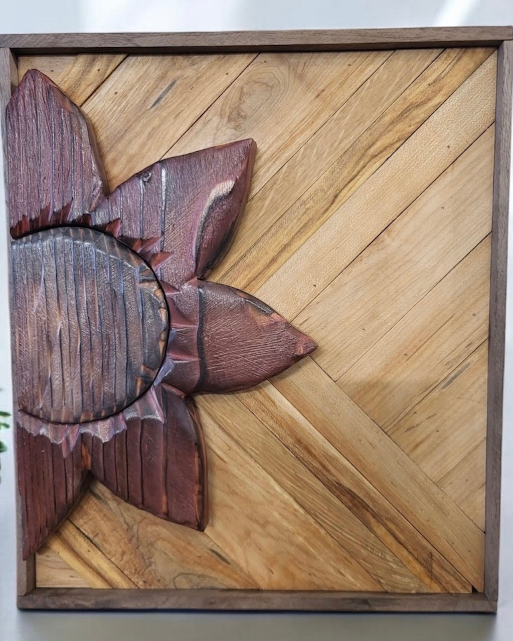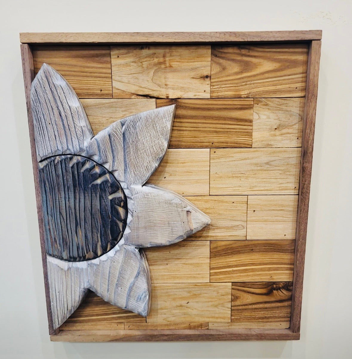 Backing is made up of reclaimed Oak & Maple with a black walnut frame, the flowers are painted/stained and the piece is sealed with polyurethane.